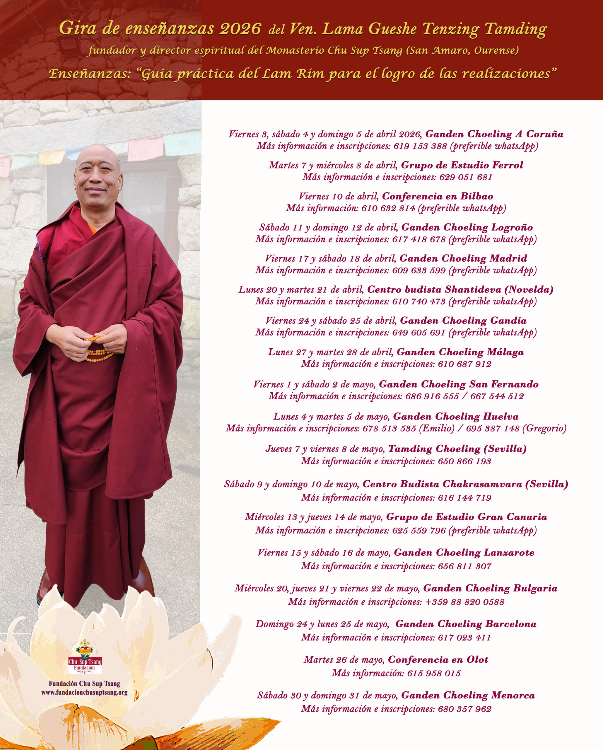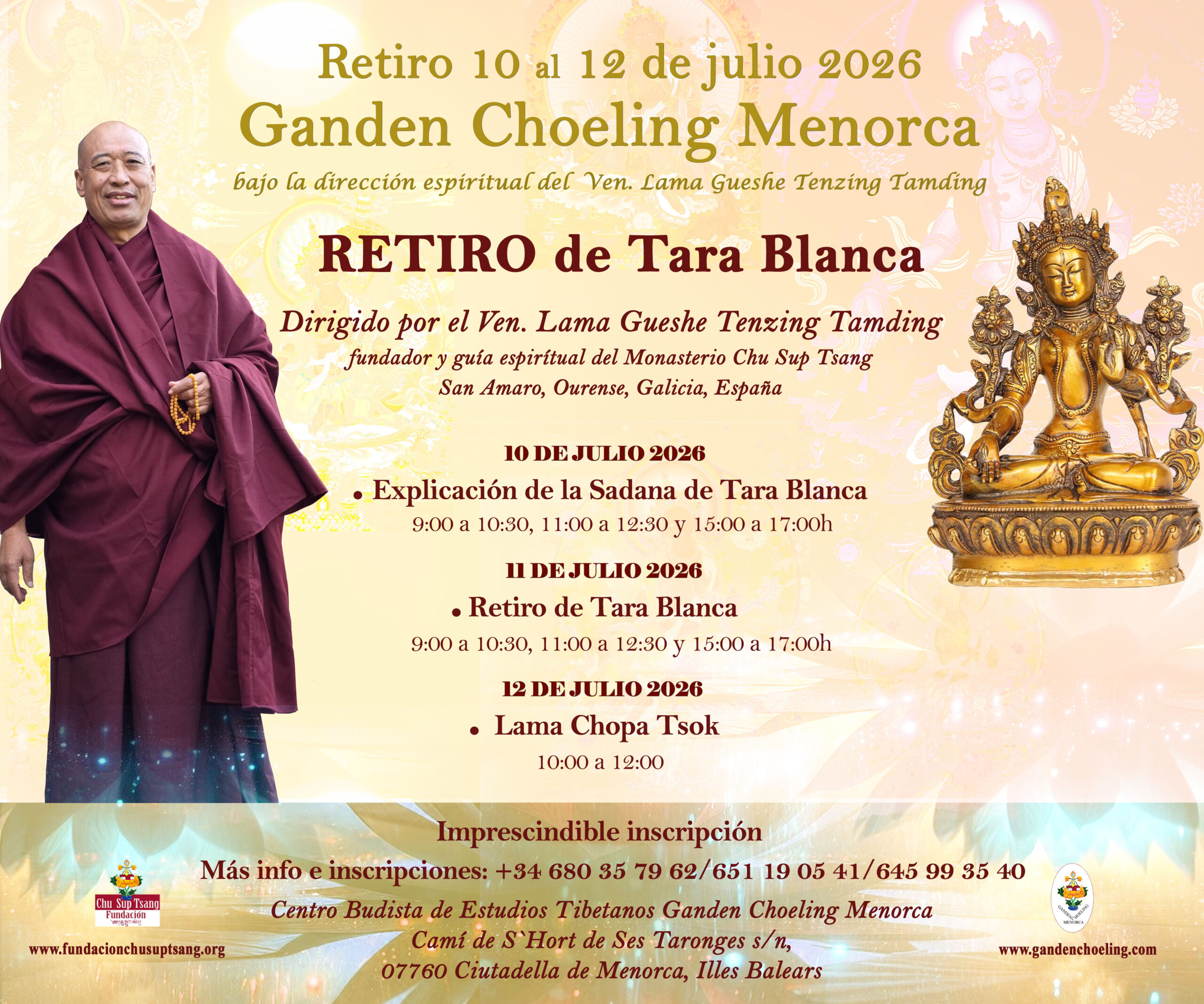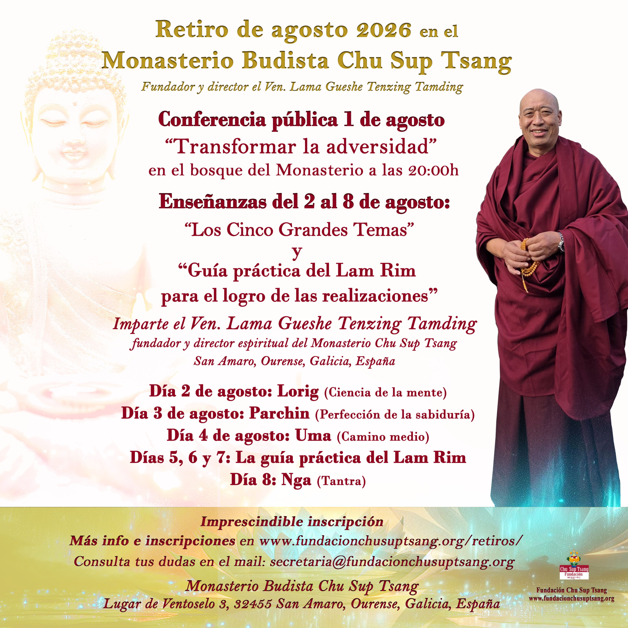 Con gran alegría anunciamos la nueva gira de enseñanzas de nuestro querido Guru Raíz, Ven. Gueshe Tenzing Tamding. Después de varios años fuera de España, por fin, lo tenemos físicamente de vuelta en su monasterio Chu Sup Tsang, en San Amaro, Ourense. La bandera del Darma ondea de nuevo y expande sonidos de compasión, sabiduría y bendiciones para todos los seres.