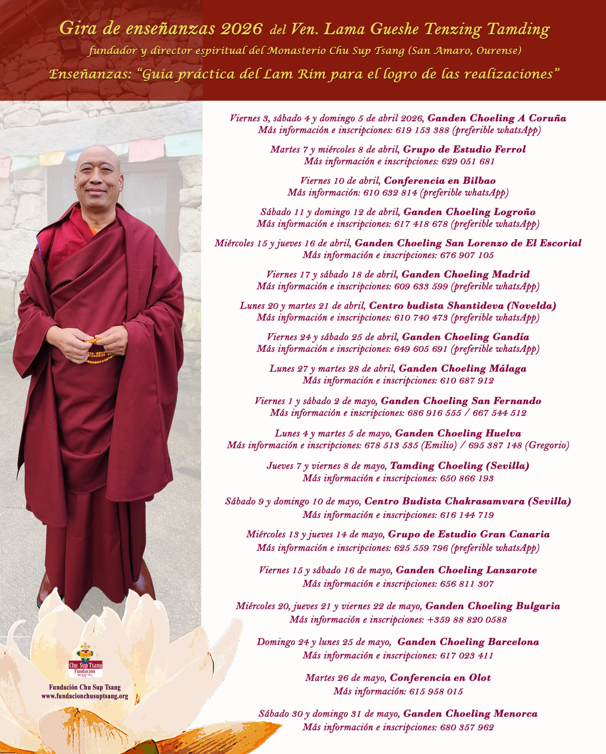 Con gran alegría anunciamos la nueva gira de enseñanzas de nuestro querido Guru Raíz, Ven. Gueshe Tenzing Tamding. Después de varios años fuera de España, por fin, lo tenemos físicamente de vuelta en su monasterio Chu Sup Tsang, en San Amaro, Ourense. La bandera del Darma ondea de nuevo y expande sonidos de compasión, sabiduría y bendiciones para todos los seres.