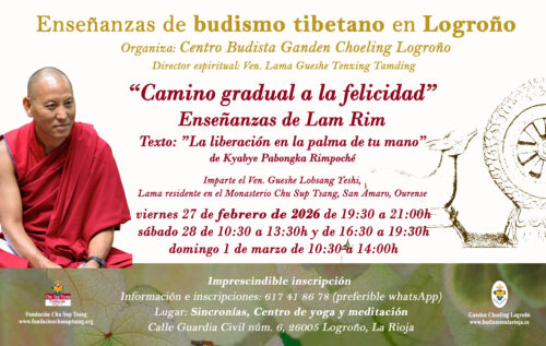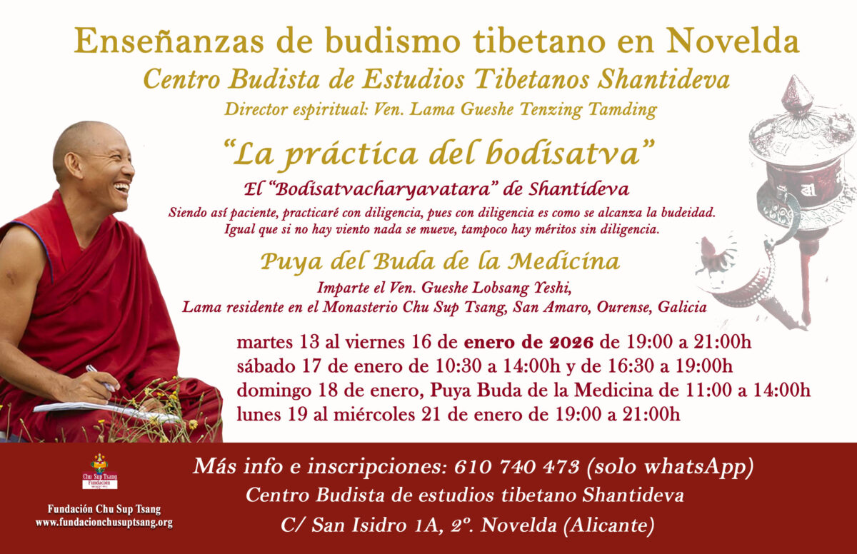 Como todos los años, el Ven. Gueshe Lobsang Yeshi se irá de Gira los meses de enero a marzo de 2026 por algunos de los Centros de Darma en España que están bajo la dirección espiritual del Ven. Gueshe Tenzing Tamding.