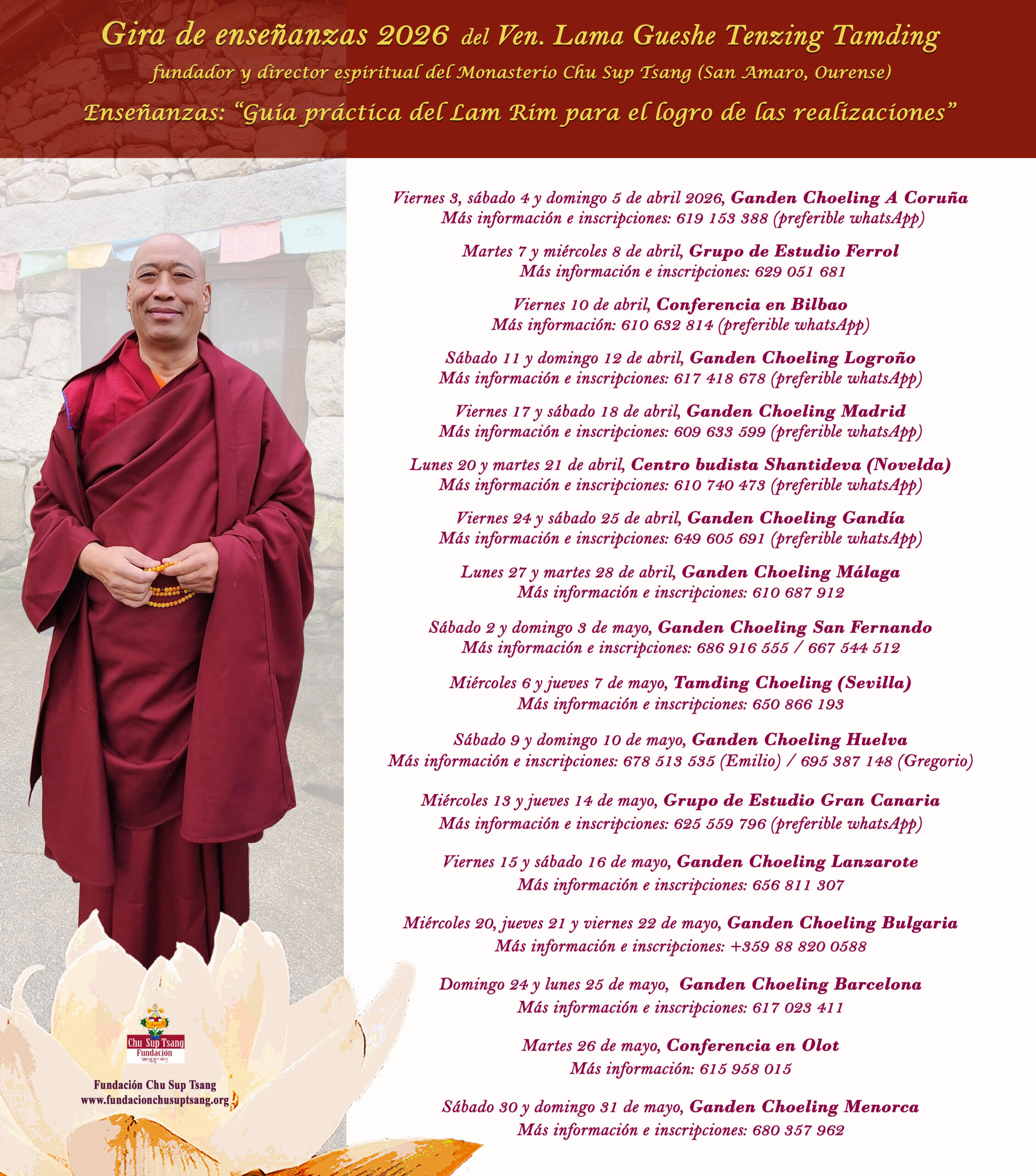 Con gran alegría anunciamos la nueva gira de enseñanzas de nuestro querido Guru Raíz, Ven. Gueshe Tenzing Tamding. Después de varios años fuera de España, por fin, lo tenemos físicamente de vuelta en su monasterio Chu Sup Tsang, en San Amaro, Ourense. La bandera del Darma ondea de nuevo y expande sonidos de compasión, sabiduría y bendiciones para todos los seres.